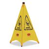 The Rubbermaid Commercial Pop-Up Safety Cone with Multi-Language Imprint and Wet Floor Symbol is collapsible and automatically deployed. The caution sign features the universal wet floor symbol and the word "caution" imprinted in English, French and Spanish for effective communication to broad audiences. The caution cone is durable, yet folds compactly when not in use. The plastic cone features a wall-mounted storage tube that allows for easy and compact storing. The bright yellow design meets OSHA requirements while the multilingual graphics are ANSI compliant. Made from durable materials, this safety sign can withstand serious abuse.